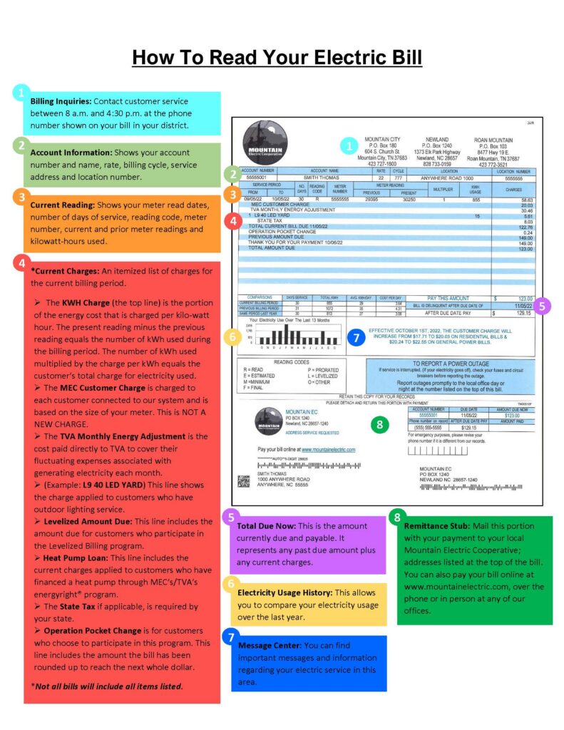 MEC would also like to inform you about the upcoming TVA monthly fuel cost for the month of March ($0.04274 per kwh), which is 61.7% higher for residential customers compared to February’s ($0.02643 per kwh). In the “How to Read Your Bill” photo, the line item called TVA Monthly Energy Adjustment is where this monthly fluctuating charge will show. This line item does not reflect the whole amount MEC pays TVA each month. On average, for every dollar MEC collects from its members, approximately $0.75 gets paid directly to TVA for MEC’s energy bill.